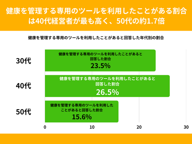 【健康を管理する専用のツールを利用したことがある割合は40代経営者が最も高く、50代の約1.7倍】
