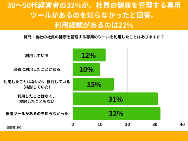 30代~50代の男女を対象とした「自社の社員の健康を管理する専用のツールを利用したことはありますか?」というアンケートで最も多かった回答は「専用ツールがあるのを知らなかった」で32%でした。