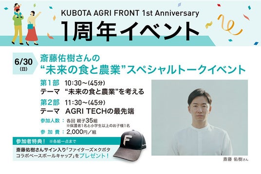 北海道ボールパークFビレッジにある農業学習施設「KUBOTA AGRI FRONT(クボタ アグリ フロント)」のオープン1周年を記念して、6月30日(日)にファイターズOB斎藤佑樹さんによるスペシャルトークイベントを開催いたします。