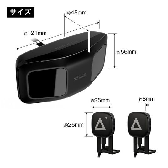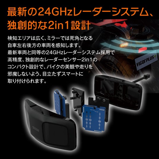 検知エリアが広く、ミラーでは死角となる左右後方の車両を感知します。 最新車両と同等の24GHzレーダーシステムを採用している為、より正確な感知が可能となっています。 独創的なレーダーセンサー2in1のコンパクト設計で、バイクの美観や走りを邪魔しないよう、目立たずスマートに取り付けが可能です。