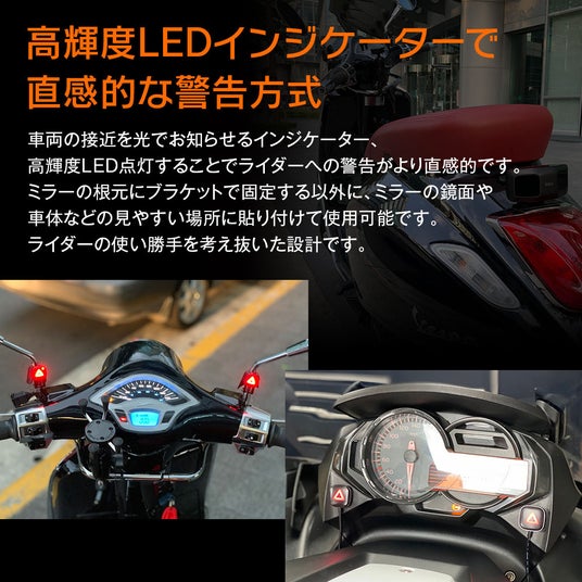 車両の接近を光でお知らせるインジケーターを高輝度LED点灯にすることで、ライダーへの警告がより直感的となります。 ミラーの根元にブラケットで固定する以外に、ミラーの鏡面や車体などの見えやすい場所に貼り付けて使用可能です。 ライダーの使い勝手を考え抜いた設計となっています。