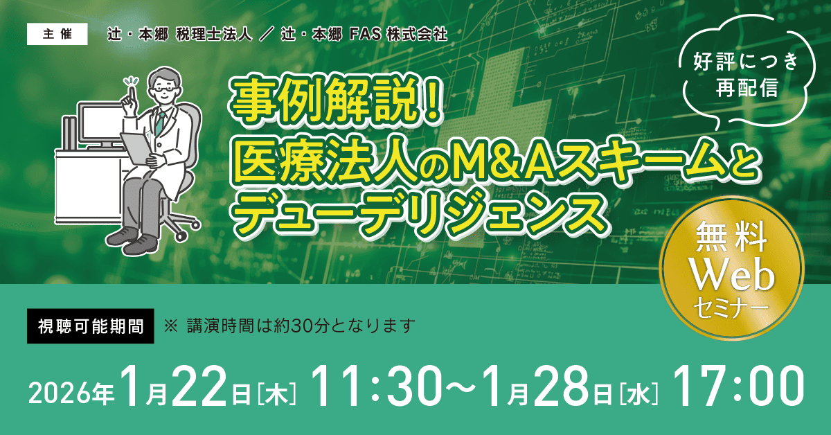 辻・本郷 税理士法人(本社:東京都新宿区、理事長:桑木小恵子)は、辻・本郷 FAS株式会社(本社:東京都中央区、代表取締役社長:山田翔吾)と共催で、2026年1月22日(木)より「【好評につき再配信】事例解説! 医療法人のM&Aスキームとデューデリジェンス」セミナーを開催いたします。