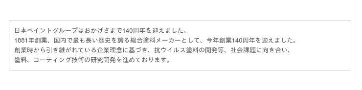 本日から始まる皆さんの日本ペイントグループでの日々が充実したものとなりますことを祈念し、皆さんの入社への式辞といたします。