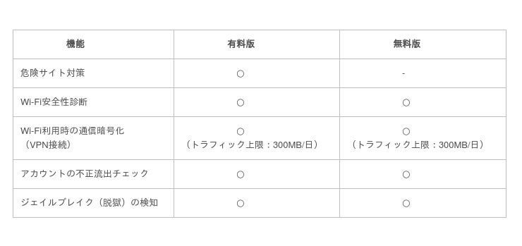 「カスペルスキー インターネット セキュリティ for iOS」は有料版のほかに、無料版も提供しています。無料版では利用できる機能に制限があります。主な機能の違いは以下の通りです。