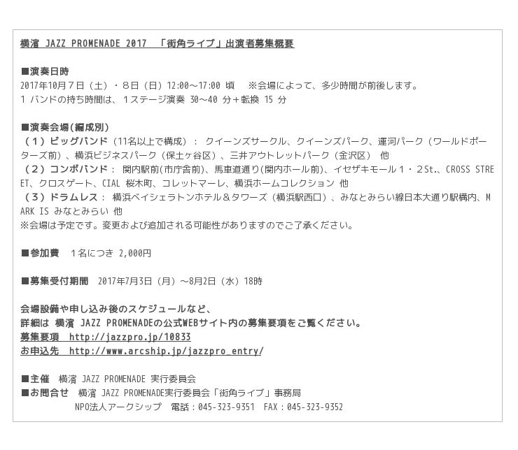 ジャズの街・横浜で、プロ・アマ2,000名を超えるミュージシャンと共に演奏しませんか?