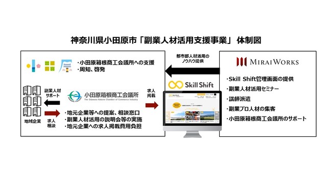 小田原箱根商工会議所が、経営課題を抱える企業に、『副業プロ人材の活用』をご紹介し、企業は経営課題を解決するための求人情報を『Skill Shift』に掲載します。小田原市は、小田原箱根商工会議所が取り組む事業を費用含めて支援し、周知、啓発をいたします。当社は、『Skill Shift』管理画面の提供、副業人材活用セミナーの開催、副業プロ人材の集客、副業プロ人材活性化のサポートを実施し、今後、本仕組みの定着・自走化を進めていくための足掛かりとして、プロジェクトをサポートいたします。