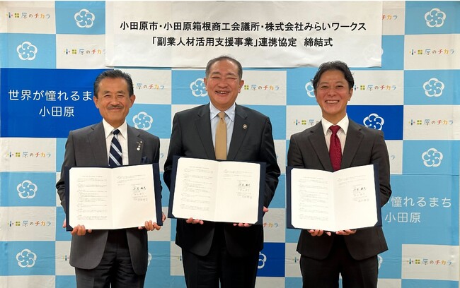 株式会社みらいワークス(本社:東京都港区、代表取締役社長:岡本祥治、以下「当社」)は、神奈川県小田原市(市長:守屋輝彦)、小田原箱根商工会議所(会頭:鈴木悌介)と、人材支援による地域企業の事業強化ならびに関係人口(※1)創出を目的とし、「副業人材活用支援事業」に係る連携協定を2023年10月10日に締結したことをお知らせいたします。今後、本協定を通じて、小田原市の中小企業と都市部副業プロ人材の活用を推進することにより、小田原市の地域経済活性化を目指します。