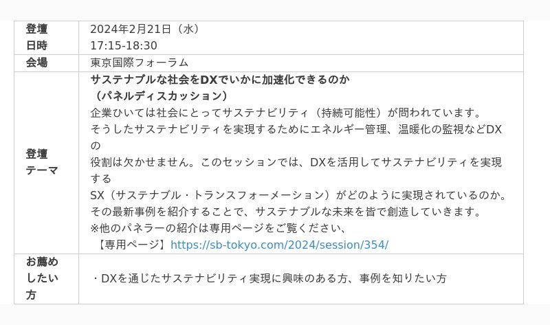 当日は、「サステナブルな社会をDXでいかに加速化できるの」をテーマに他のパネラーと、DXによってSX(サステナブル・トランスフォーメーション)がどのように実現されているのかがわかる最新事例をご紹介する予定です。