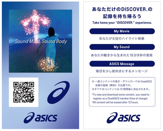 「DISCOVER. by ASICS」は、運動に馴染みのない人でも自然と動きたくなる仕掛けが詰まった新感覚アクティビティです。あなただけの「Sound Mind, Sound Body(サウンドマインドサウンドボディ)」を見つける体験と題して、体験エリアと販売エリアの2つのエリアを用意しています。体験エリアは、アシックスの研究によって導きだされた、心身にポジティブな影響を与えることができる運動時間「15分9秒」を体験できるよう構成されています。音と光で演出された没入型空間で、本来の自分と向き合う非日常体験をお楽しみいただきます。また販売エリアではアシックスのさまざまな商品を展開し、継続的な運動のきっかけづくりもサポートします。