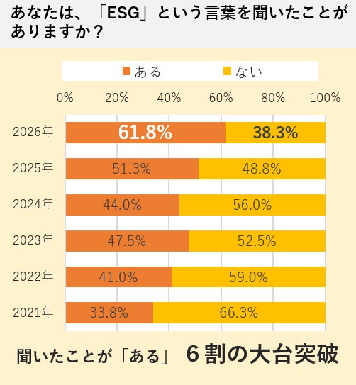 ・「ESG」という言葉を聞いたことがある 61.8%に・企業の環境対応度合いと投資対象としての安定性に注目 長期的な視点が浸透か