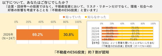 「ESG」という言葉を聞いたことがあると回答した人に対し、「不動産のESG投資」の認知を尋ねたところ、「知っていた」は69.2%でした。 なお、「不動産」と「ESG」の両語を合わせて報道する新聞記事数は、ピーク時(2021年)から半減していますが(当社調べ)、ESGという言葉自体を認知している不動産投資家の間では一定の浸透が進んだ結果といえるでしょう。