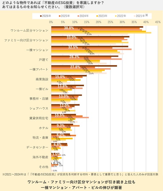 反面、各項目の割合は前年からの変化が大きく、とりわけ「一棟マンション」(前年比6.7ポイント増)、「一棟アパート」(同9.3ポイント増)、「一棟ビル」(同3.3ポイント増)は伸びが顕著です。“一棟モノ”への投資検討時、環境対応を中心に物件のESGの要素を意識する傾向が高まっているといえるでしょう。