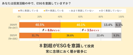 ESGという言葉の認知率の向上および理解の浸透に伴い、ESGの枠組みを前提として日々の投資活動を行う層が着実に増えているといえそうです。