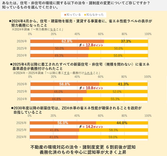 2025年4月までに変更が実施された、事業者の省エネ性能ラベル表示の努力義務、および新築物件の省エネ基準適合義務については、各キーワードの認知率が前年に続いて増加し約6割に達しました。また、2030年度以降に予定される新築住宅の政府目標も、認知層は前年比14.2ポイント増で半数を超えました。