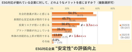 企業のESG対応は、社会貢献性だけでなく、リスクの低さや株価の長期的な成長といった投資対象としての「安定性」に対する期待醸成に繋がりつつあるといえるでしょう。