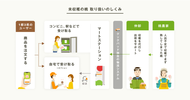 そこで今回、山梨県の生産者や市場の仲卸、加工事業者をつなげ、クックパッドマート独自の流通網を活用することで、食べられるはずの桃の廃棄を減らし、低価格でクックパッドマートユーザーに旬の桃を届ける施策の実施に至りました。