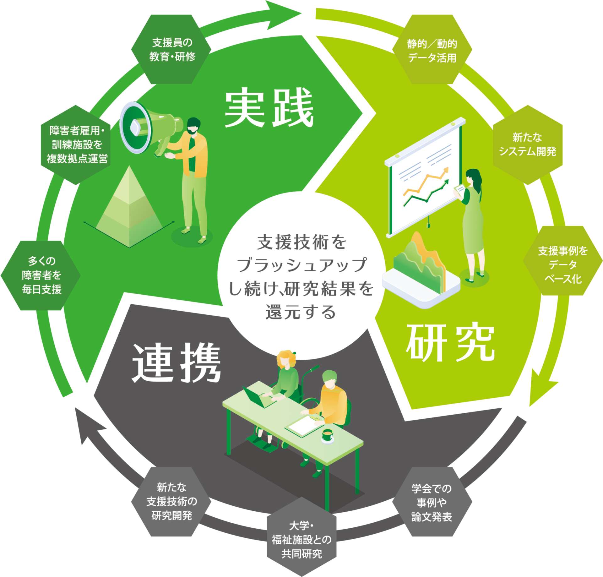 ABA(応用行動分析)やCBS(文脈的行動科学)、第三世代の認知行動療法に基づいた効果的で専門的な支援で、障害者雇用の新しい「場」づくりから定着支援までワンストップで実現する会社です。