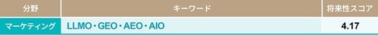 時流を踏まえて今回から新たに追加したキーワードは、マーケティング分野の「LLMO・GEO・AEO・AIO」です。分野別スコアランキングは、31キーワード中7位でした。
