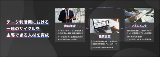 - 業務に直結する「データ利活用」スキルを段階的に習得 課題発見からデータの整理・分析・可視化、改善提案までを一貫して学ぶことで、実務への展開を見据えたスキルを体系的に習得できます。