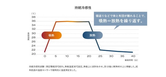 中わたの繊維に、宇宙服のために開発された革新的な冷感テクノロジーPCMをマイクロカプセル化し配合。一般的な接触冷感寝具は、吸熱した熱が飽和状態になるとその冷感性は損なわれますが、エアースローは、睡眠中の寝返りなどにより布団と体が離れることで冷感が復活し、維持します。