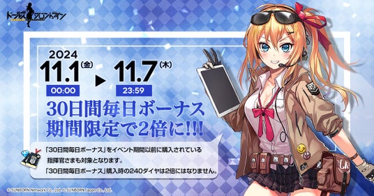 「11月1日(金)0:00~11月7日(木)23:59」の期間中、「30日間毎日ボーナス」にて毎日獲得可能なダイヤが2倍になりますので、お受け取りをお忘れなく!