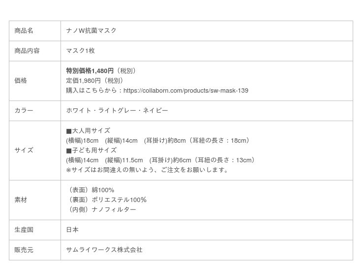 サムライワークス株式会社(代表取締役社長:新島 実 本社所在地:東京都渋谷区)は、第3波拡大防止の対策として、医療用レベルで飛沫防止ができる『ナノ抗菌マスク』をさらに進化させた「ナノW抗菌マスク」を好評につき特別価格1枚1,480円(税別)で追加販売することを決定いたしました。