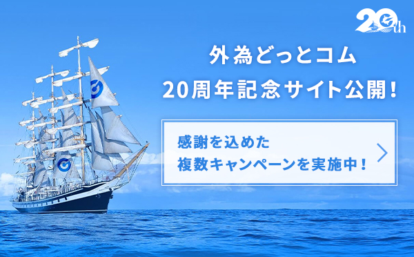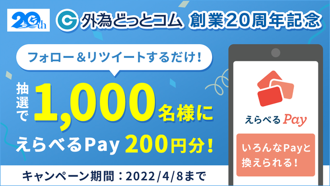株式会社外為どっとコム(以下「外為どっとコム」、本社:東京都港区、代表取締役社長:竹内 淳)は、2022年4月1日、創業20周年を迎えました。これもひとえにお客様からの多大なるご支援あってのものであり心より感謝申し上げます。外為どっとコムでは2022年4月1日からの1年間を「20周年記念イヤー」として、創業20周年記念サイトの公開、およびお客様への感謝の気持ちを込めたキャンペーンを開始いたします。