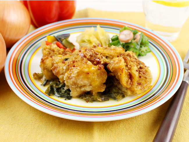 鶏もも肉のから揚げに、甘酸っぱくてマイルドなハニーマスタードソースを合わせました。添え野菜の菜の花は、ほろ苦さがソースとよく合いクセになります。仕上げに振りかけたフライドオニオンの香ばしい風味もお楽しみください。