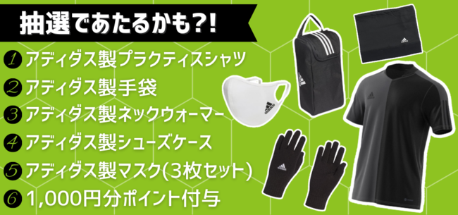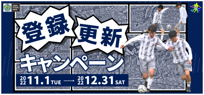 アディダスフットサルパークでは、これからご登録・ご更新をしてコートをご利用していただくチームの皆様にとってお得なキャンペーンを実施いたします。また、ご登録・ご更新をしていただいたチームの中から、抽選でノベルティをプレゼントいたします。皆様のご登録・ご更新をお待ちしております。