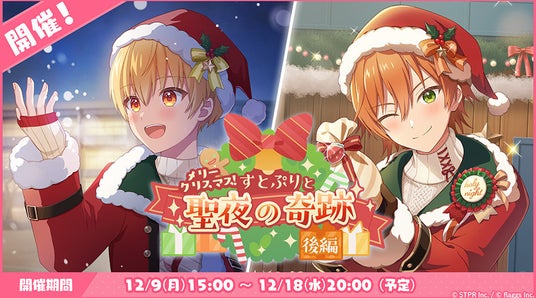 株式会社STPR(本社:東京都渋谷区、代表取締役:柏原 真人、以下STPR)と株式会社flaggs(フラッグス)(本社:東京都品川区、代表取締役CEO:吉江 直人)は、本日12月9日(月)に2.5次元アイドルグループ「すとぷり」の公式ゲームアプリ「すとぷりWith!!(通称:すとうぃず)」のゲーム内イベント「メリークリスマス!すとぷりと聖夜の奇跡 後編」の開催についてお知らせいたします。