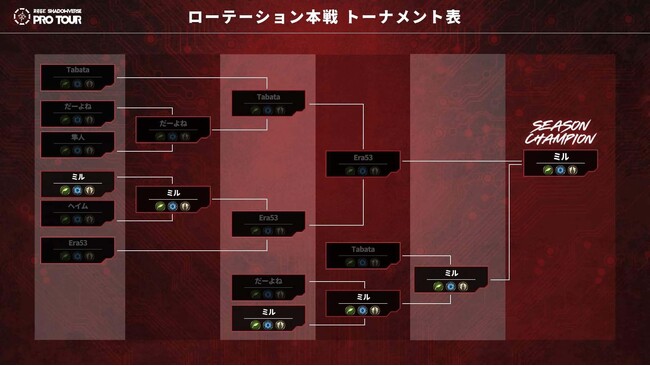レギュラーシーズン最後の試合となるローテーション FINALのカードは、Era53選手とミル選手の対戦。Day1 ROUND2 MATCH2の再戦となりました。互いに1試合ずつ取り合うFINALにふさわしい展開となりましたが、5試合目はライフの削り合いとなった中で、ミル選手が実況解説をはじめユーザーを唸らせるプレイを連発し、そのまま押し切って勝利。個人としてRSPT初優勝、チームとしては4回目の優勝となりました。試合後、ミル選手は「素直に優勝はうれしいです」と率直な喜びを口にしていました。