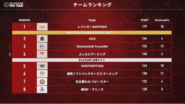 5th Seasonが終了し、年間最終順位とPLAYOFF出場チームも決定しました。1位のレバンガ☆SAPPOROがレギュラーシーズン最多勝利でチームのチームランキング首位通過、PRO TOUR CHAMPIONSHIP出場が確定しました。一方、PLAYOFFにはAXIZ・DetonatioN FocusMe・よしもとゲーミングの3チームが出場となりました。PLAYOFFは2024年1月7日(日)にASH WINDER Esports ARENA 高田馬場店にてオフライン開催され、入場料は無料です。