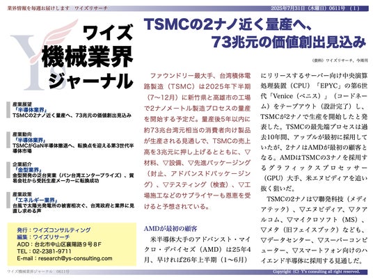 ワイズコンサルティング グループ(本社:中華民国台北市、代表取締役:吉本康志)は台湾機械業界専門誌「ワイズ機械業界ジャーナル」の2025年7月第5週号を発行しました。