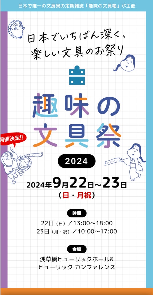 日本で唯一の文房具雑誌『趣味の文具箱』を運営する、株式会社ヘリテージ(本社:東京都新宿区、代表取締役:齋藤 健一、以下 ヘリテージ)は、文房具を愛し、人生をとことん楽しむための ”文具のお祭りイベント”である「趣味の文具祭(しゅみのぶんぐまつり)」を、2024年9月22日(日)~9月23日(月祝)に、前回より規模を大きくして、浅草橋ヒューリックホール&ヒューリックカンファレンスを会場に開催いたします。