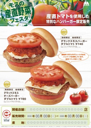 この期間中は、モスの契約農家である青森県の「JA青森トマト部会 東つがる支部」(青森県東津軽郡蓬田村)の畑で収穫されたトマトを直接店舗に運び、「デラックスモスバーガー ダブルトマト」と「デラックスモスチーズバーガー ダブルトマト」を期間限定で販売します。さらに、素材のおいしさをそのまま味わっていただけるよう、同組合で収穫されたトマトを、お持ち帰り用で販売します※。(1個:200円 /数量限定 なくなり次第終了します。)