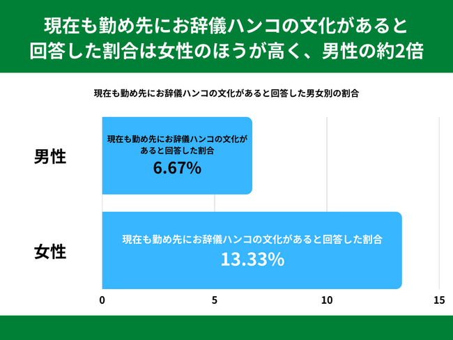 現在も勤め先にお辞儀ハンコの文化があると回答した割合を男女別でみてみますと、女性が13.33%、男性が6.67%という結果になりました。