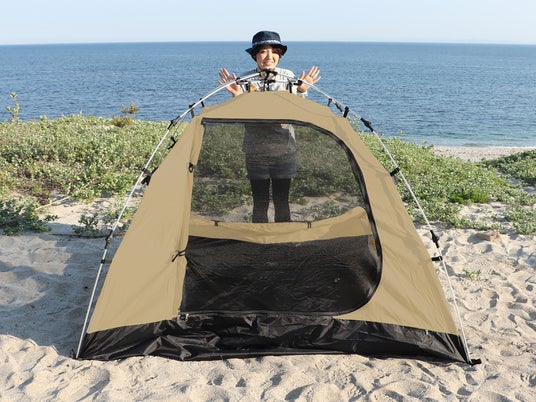 避難所に個室空間を1分で確保。2人用テント「ワンタッチカンガルーテントS」