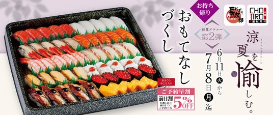 にぎり長次郎のお持ち帰りセット商品『おもてなしづくし』は季節により盛り込み内容が変わる商品。 6/11(火)~7/8(月)までは、旬の「しまあじ」や「はも」、「本まぐろ中とろ」・「煮あわび」も盛り込んだ豪華な桶になっており、ちょっといい日にぴったりです。