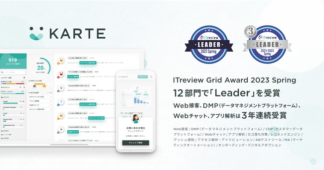 株式会社プレイド(東京都中央区:代表取締役CEO 倉橋健太)の提供するCXプラットフォーム「KARTE」が、アイティクラウド株式会社(東京都港区:代表取締役社長 黒野源太)運営のIT製品レビュープラットフォーム「ITreview(アイティレビュー)」において満足度・認知度ともに優れた製品であると評価され、「ITreview Grid Award 2023 Spring」の12部門にて4期連続で「Leader」を受賞しました。