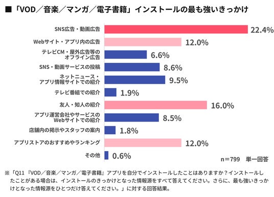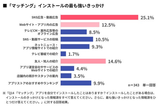 本調査では、アプリを12カテゴリに分け、各カテゴリのアプリのインストール経験がある人に、そのきっかけとなった情報源について尋ねています。「店舗系会員」アプリを除くすべてのアプリカテゴリで、「SNS広告・動画広告」が「インストールの最も強いきっかけとなった情報源」の上位3位以内に入りました。