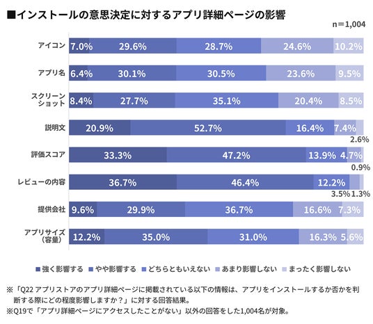 アプリ詳細ページに掲載されている各情報が、インストールの意思決定にどの程度の影響を与えるかを尋ねた結果が下のグラフです。「評価スコア」「レビューの内容」が「影響する※」と回答したのは全体の80%以上。「説明文」も70%以上の人が影響する※と回答しています。