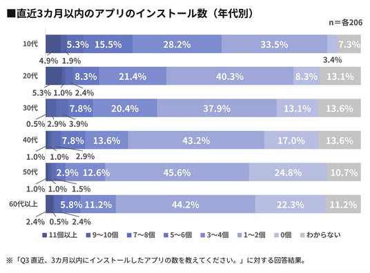 直近3カ月以内にインストールしたアプリの数は、全体で見ると「1~2個」が40.8%で最も大きな割合を占めました。性別、年代別の集計からは、男性、若年層のほうがインストール数が多いという傾向を読み取ることができます。