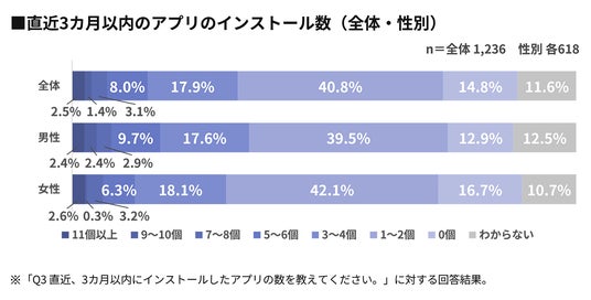 - 40.8%が直近3カ月のアプリのインストール数を「1~2個」と回答