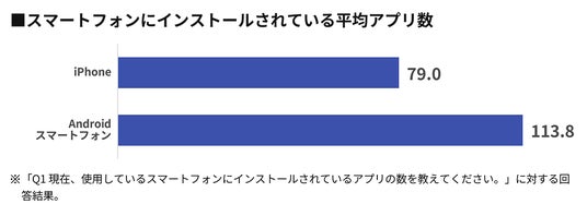 - インストールされている平均アプリ数は「iPhone」で79個、「Androidスマートフォン」で113.8個