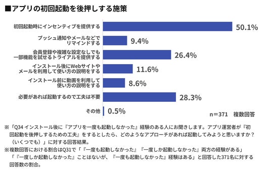「一度も」起動しなかった経験を持つ371人に、どのようなアプローチがあれば初回起動に繋がるかを尋ねた結果が下のグラフです。50.1%が「初回起動時にインセンティブを提供する」と回答。初回起動の促進においてもインセンティブが有効に機能することがわかりました。