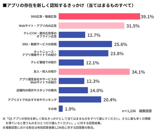 - アプリの存在を認知するきっかけは「SNS広告・動画広告」がトップ。「当てはまるものすべて(複数回答)」で39.1%が選択、「最も多くの情報を得ている(単一回答)」でも全体の20.6%を占める。一方で認知施策として重宝されていたテレビCMなどのオフライン広告は下位に沈んだ