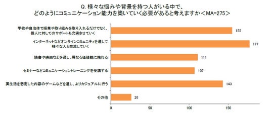 また、「様々な悩みや背景を持つ人がいる中で、どのようにコミュニケーション能力を築いていく必要があると考えますか<MA>」と尋ねると、「インターネットなどオンラインコミュニティを通して様々な人と交流していく」(177) と回答した人が最も多く、次に、「学校や自治体で授業や取り組みを取り入れるだけでなく、個人へ対してのサポートを充実させていく」(155)と回答が多く集まりました。このことから、学びの場が学校内に留まらず多様化していく中で、それに合わせて、非認知能力と呼ばれる能力を、様々な方法で身につけていく必要があるということがわかりました。
