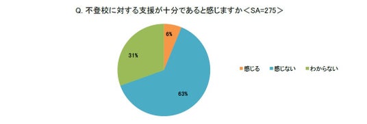 そして、「不登校に対する支援が十分であると感じますか<MA>」と尋ねたところ、「感じる」(17)と回答した親は1割以下に留まり、「感じない」(174)、「わからない」(84)は合わせて9割以上となりました。これらのことから、不登校に関する捉え方が社会全体的に変わりつつあるものの、実際にはまだ支援が不十分であることがわかります。