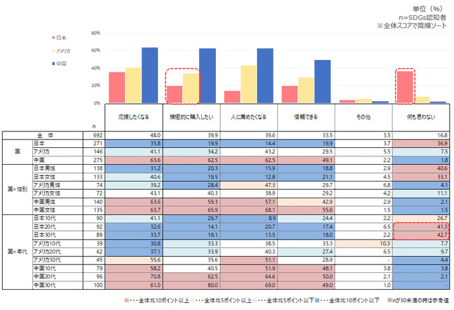 日本とアメリカは「積極的に購入したい」の割合が中国と比較して低く、購買行動への影響力は小さいと推察される。