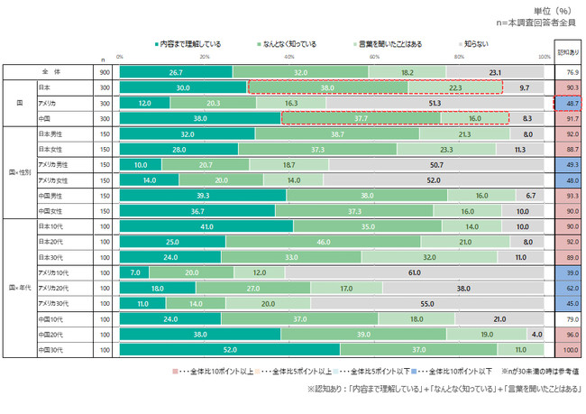 ただしその内訳をみると「なんとなく知っている」「言葉を聞いたことはある」で半数以上を占め、2ヵ国ともに理解度はいまひとつとうかがえる。